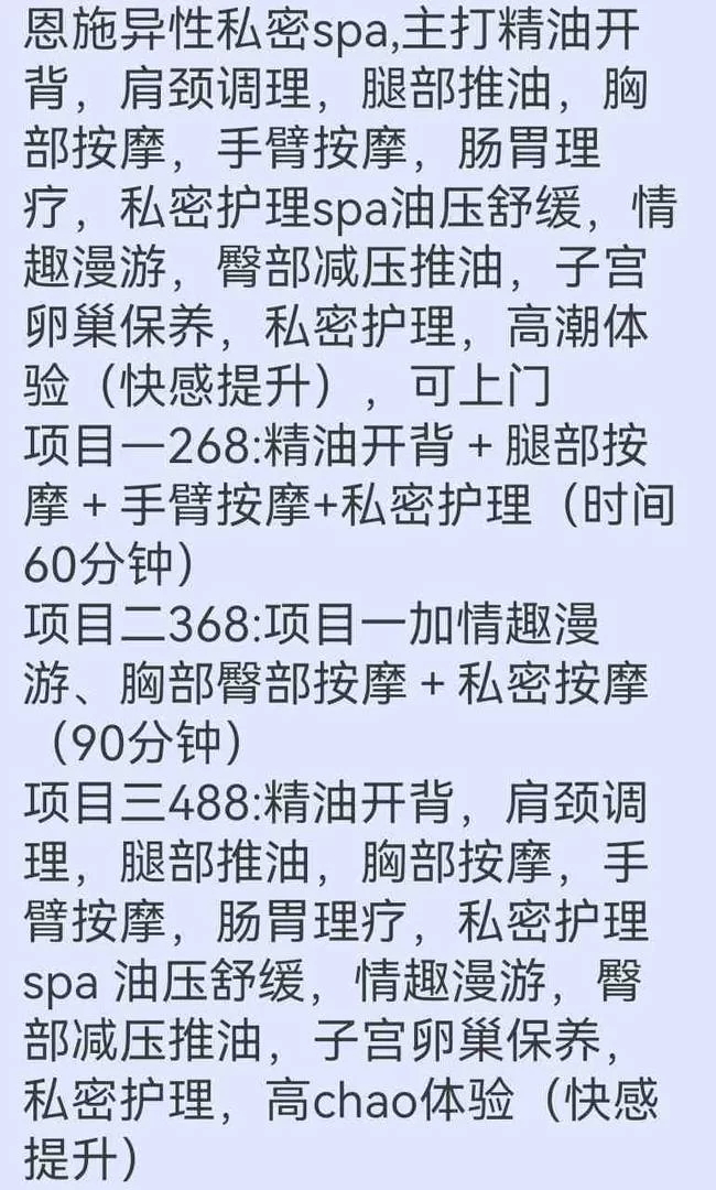 恩施异性私密spa,主打精油开背,肩颈调理,腿部推油,胸部按摩,手臂按摩,肠胃理疗,私密护理spa油压舒缓,情趣漫游,臀部减压推油,子宫卵巢保养,私密护理。 [增加联系方式] 2026-03-15 0 恩施 足浴洗浴